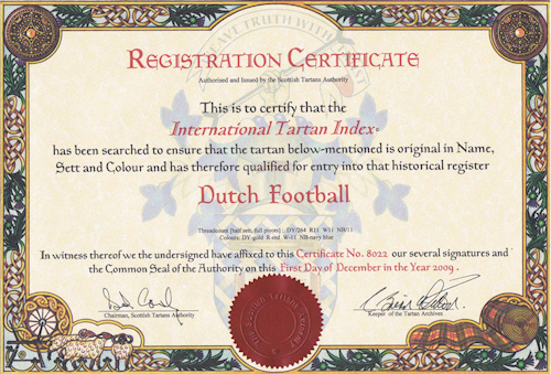 Een tartan met onze nationale kleuren door ons ontworpen en geregistreerd.